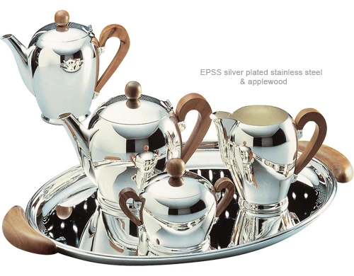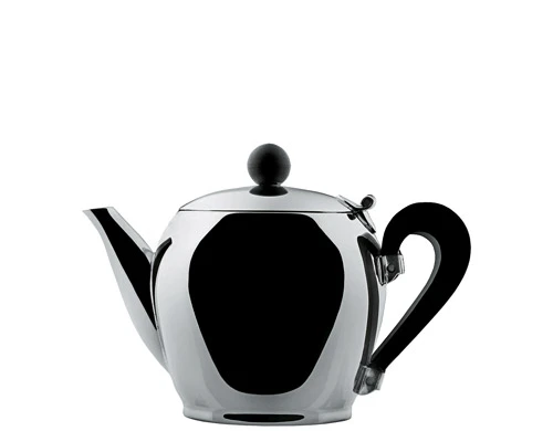 Designed in 1945, this service was first produced in chrome-plated and silver-plated heavy brass, and later in stainless steel. The Bombé collection is still one of the most successful tea and coffee sets sold by Alessi and was Carlo Alessi’s last design. The Teapot is offered in 18/10 stainless steel, with handle and knob in bakelite or EPSS silver-plated stainless steel with handle and knob in applewood. Also available as coffee pot.