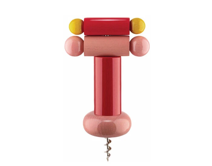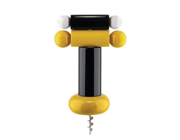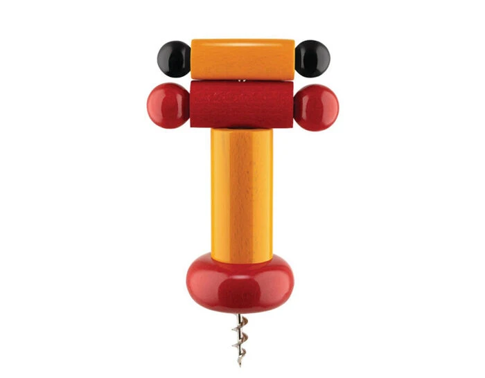 The corkscrew according to Ettore Sottsass: a tool both effective and emotional. Easy to use: the designed volumes reveal an ergonomic shape that is comfortable to hold. Made in Italy, near where Alessi is based, using a partly hand-crafted turning process with wood from a sustainably managed forest. Colored with water-based and totally solvent-free paints that are sustainable for the environment and not harmful to human health.